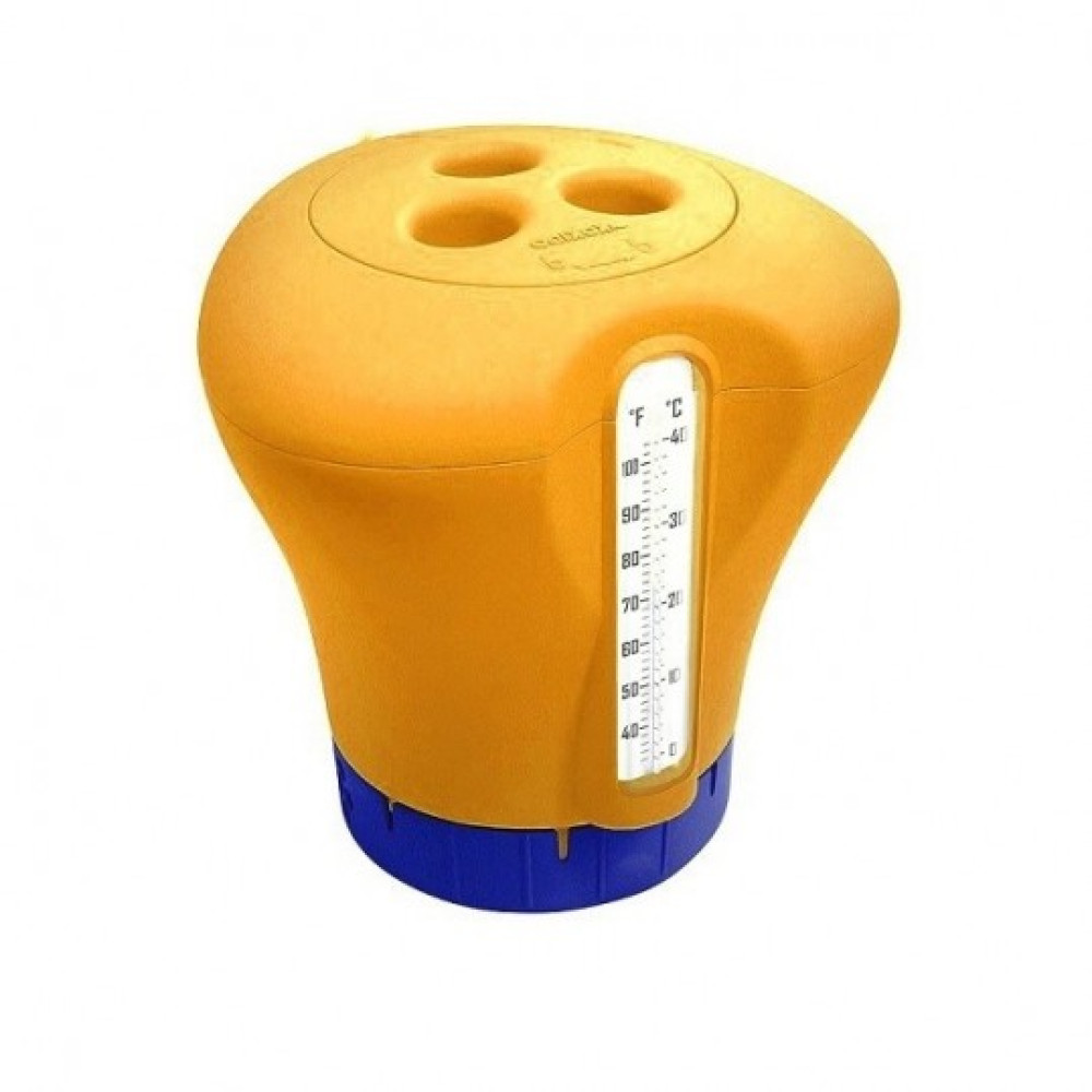 Плавающий дозатор-термометр Kokido K619BU для хлорирования бассейнов. Изготовлен из безвредного полимера. Регулирует интенсивность попадания дезинфицирующих веществ в воду бассейна. Оснащен термометром со шкалой Цельсия и Фаренгейта. Не содержит стекла и ртути. Таблетки в комплект не входят.