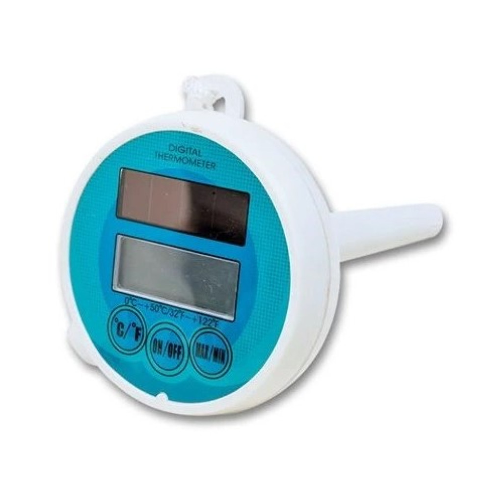 Цифровой плавающий термометр Современный солнечный термометр идеально подходит для измерения температуры воды в любом типе бассейна. Термометр можно легко прикрепить к лестнице бассейна, например с помощью практического шнура. Диапазон температур: 0–50 ⁰C. Кнопки – переключатель ⁰C/⁰F, ON/OFF и MAX/MIN. Встроенная батарея типа «кнопка» служит резервным источником питания, когда солнце не светит на солнечную панель.
