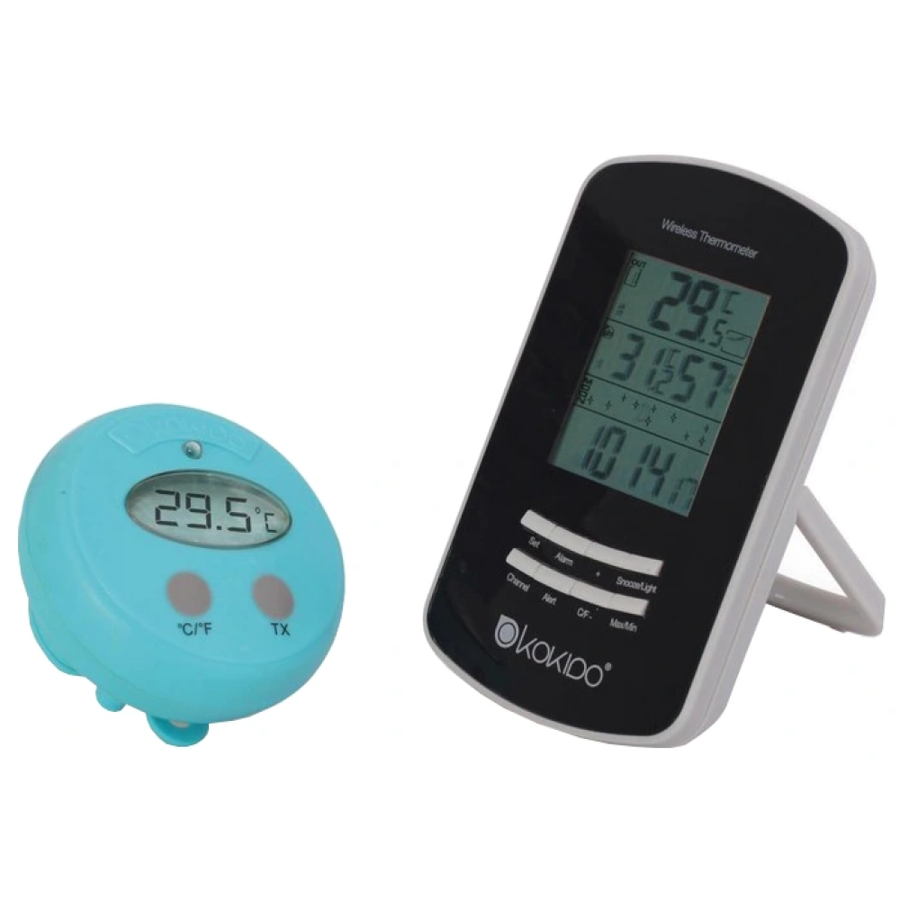 Термометр цифровой Kokido K617CS многофункциональный из 2 устройств. Базовая станция может быть установлена на горизонтальной или вертикальной поверхности внутри помещения. Показания плавающего датчика передаются на базовую станцию, которая отображает температуру, влажность воздуха и другие параметры. Теперь чтобы узнать температуру воды нет необходимости приближаться к бассейну. Максимальное расстояние между датчиком и базой 30 метров. Батарейки АА в комплект не входят.