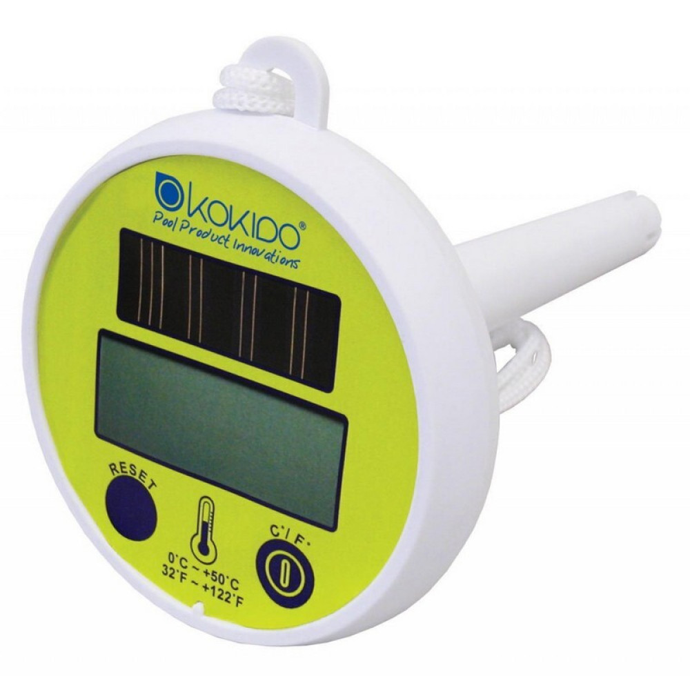 Термометр плавающий цифровой на солнечных батареях Kokido K837CS. Не требует замены батареек. Отображает температуру воды в градусах Цельсия или Фаренгейта. Имеет функцию автоматического отключения. Корпус изготовлен из безвредного полимера, не содержит вредных элементов и острых частей. Оснащен эластичным шнурком для крепления к краю бассейна.