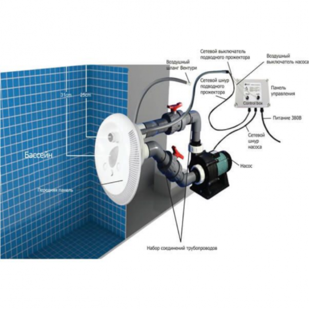 КомплектацияНасос Emaux AFS55 - мощностью 4,0 кВт; закладная и лицевая деталь из прочного ABS пластика (под лайнер или бетон); встроенный многоцветный LED-прожектор; блок контроллер на 380 В; встроенная пневмокнопка; необходимые соединительные элементы и краны; инструкция