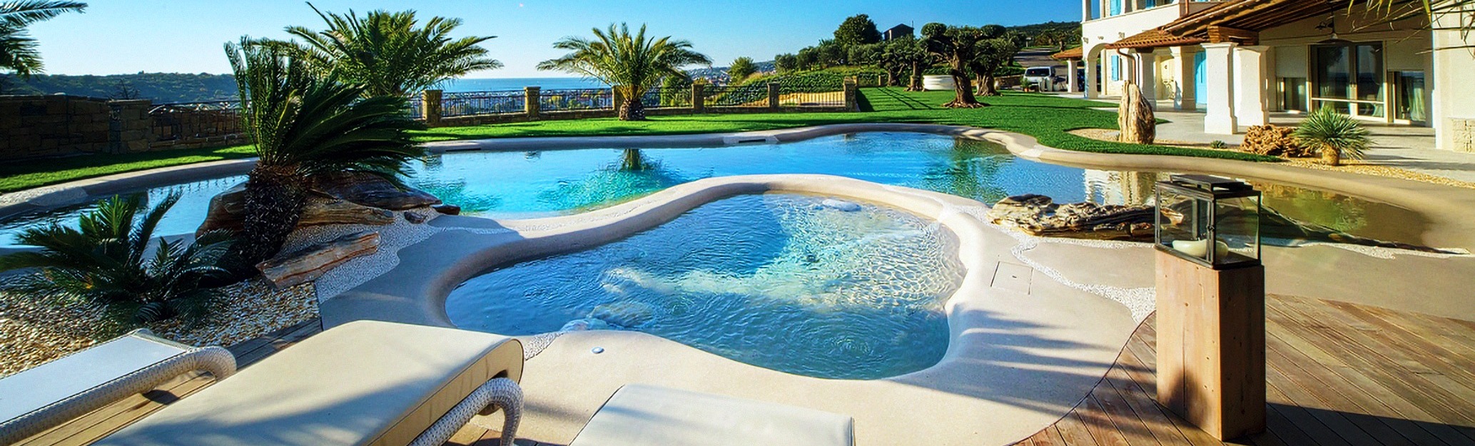 Мечту о мелководном пляже с плавными спусками легко сделать реальностью. Оборудуйте на своем участке бассейн с песчаным берегом. Вам будет предоставлена возможность выбора угла наклона стен, организации отдельных зон для занятий плаванием и ныряния на оптимальную глубину. Любители дайвинга могут декорировать дно натуральным камнем.