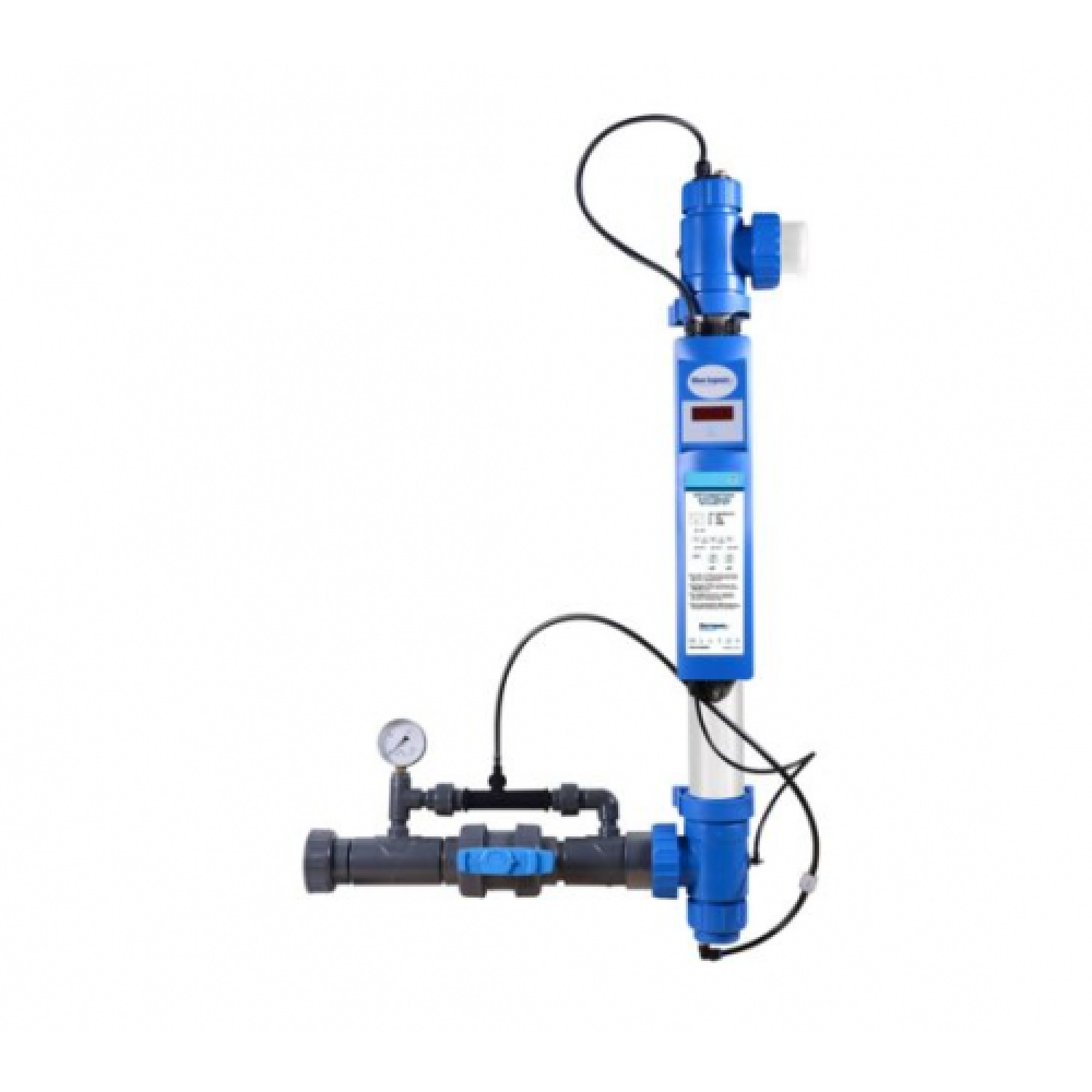 Устройство Blue Lagoon Ozone UV-C обеззараживает воду озоном (O3) и ультрафиолетовым излучением UV-C с длиной волны 253.7 нанометра, что позволяет свести хлорирование воды в вашем бассейне к минимуму! В процессе обработки воды озон под действием UV-C – лучей превращается в кислород, одновременно образуя гидроксильные радикалы – частицы, обладающие сверхмощными окислительными свойствами. Образовавшиеся гидроксильные радикалы существуют 2,7 микросекунды, но успевают за этот короткий промежуток времени окислять любые загрязнения в воде, в том числе растворимые. Таким образом, на выходе из установки Blue Lagoon Ozone UV-C, вода полностью очищена и стерильна. Установил устройство Blue Lagoon Ozone UV-C в системе водоподготовки. вашего бассейна, вы сможете поддерживать воду в чистом, свежем, и, что самое главное, санитарно безупречном состоянии. Данная установка Blue Lagoon Ozone UV-C может быть использована в бассейнах с соленой водой. Принцип работы УФ лампы с озонатором. Давление в реакционной камере можно контролировать по манометру и регулировать шаровым краном. Оптимальное давление составляет от 0.4 до 0.7 бар. Воздух всасывается в устройство через воздушный клапан и поступает в зазор между кварцевой трубкой и ультрафиолетовой лампой UV-C озонатора. Проходя мимо специальной озонирующей лампы, воздух обогащается озоном; Производительность озонирующей лампы составляет 0.6 г озона. Через шаровой кран обогащенный озоном воздух поступает в реакционную камеру и смешивается с водой. При этом он окисляет органические вещества и обеззараживает воду, обеспечивая эффективную дезинфекцию. Смесь воды и озона затем подвергается воздействию излучения лампы UV-C, размещенной в корпусе из нержавеющей стали. Эта лампа выполняет две функции, одновременно вырабатывая озон и ультрафиолетовое излучение диапазона UV-C. Выполнив свои функции, молекулы озона разрушаются в воде еще до выхода из устройства. микробов• Препятствует образованию плесени, бактериального налета и водоростей• Позволяет снизить использование хлора и других химикатов от 50 до 80%•