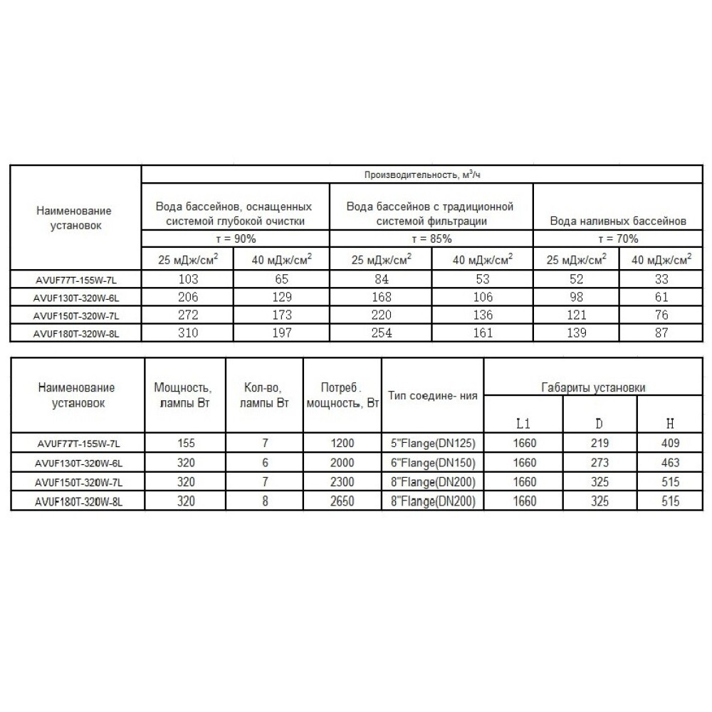 - Скорость потока: 115 м³/ч при 25 мДж/см2