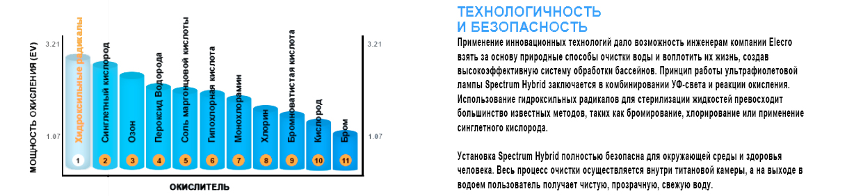 Для обеззараживания воды в вашем резервуаре стоит подобрать качественный и современный ультрафиолет для бассейна. Модель Elecro Spectrum Hybrid UV+HO — универсальное и максимально эффективное решение для уничтожения микробов, бактерий, вирусов, плесени, других микроорганизмов, и грибков. Благодаря совмещению работы ультрафиолетовых ламп и ОХ гидроксильных радикалов, устройство делает воду безопасной и чистой. Благодаря такой дезинфекции, вы сможете обеззаразить свой бассейн, при этом не используя химические вещества и хлор. После прохождения воды через систему, она лишается посторонних запахов, не жжет кожу и не вызывает раздражения. Для того, чтобы система не давала сбой во время скачков напряжения или возникновению помех, в нее встроены балласт и дроссель. Оптимальный объем бассейна для эффективного очищения, не должен превышать 50м³. Лампы мощностью 55 Вт служат ~ 9000 часов.