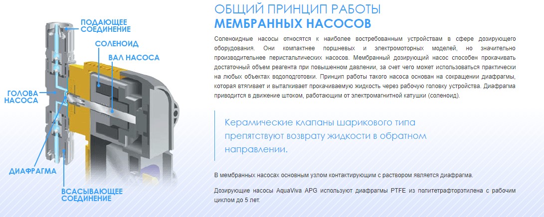 Данный тип аппаратов обеспечивает надежную и эффективную работу в течение многих лет. Простые системы имеют мембрану, два клапана, камеру смещения и приводной механизм. Производительность данного прибора — 15 литров в час, присутствует регулировка впрыскивания (0-100%), контроль уровня и аналоговая панель управления. Мембранные агрегаты являются наиболее часто используемыми дозирующими насосами, и они признаны эффективными, безопасными, точными и универсальными. Что касается особенностей серии APG: в системе присутствует простое и понятное меню для настройки параметров дозирования, стойкие шариковые клапаны, изготовленные из керамики, что делает систему более надежной.