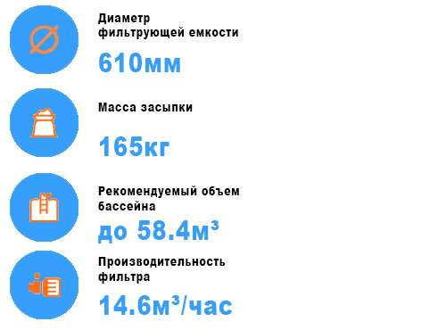 Фильтр для бассейна Emaux T600B Volumetric (D610) может быть использован в чашах объемом до 58,4 м3. У него довольно высокая производительность – 14,6 м3 в час. Корпус цельный дутый, имеет подставку внизу. Масса песка для очистки – 165 кг. Подключение верхнее, фильтрующая емкость диаметром 610 мм. Такой фильтр можно использовать не только в бассейнах и СПА, но и в искусственных водопадах и фонтанах.Для изготовления корпуса фильтра используют термостойкий полиэтилен. Его клапан может занимать 6 разных позиций, от чего зависит выбор необходимого цикла работы. Он предназначен для очистки емкости, обратной промывки, рециркуляции, слива наполнителя и воды. Для полного дренажа внизу прибора есть отверстие с заглушкой. Процесс подключения и обслуживания фильтра не причиняет трудностей, поскольку на горловине самого прибора есть обжимное кольцо с резьбовым винтом.Модель обладает высоким сопротивлением к влаге, UV-излучению и химикатам.
