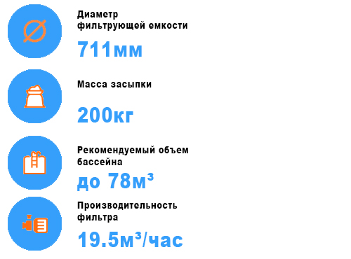 Масса песка для очистки – 200 кг. Подключение верхнее, фильтрующая емкость диаметром 711 мм. Такой фильтр можно использовать не только в бассейнах и СПА, но и в искусственных водопадах и фонтанах.