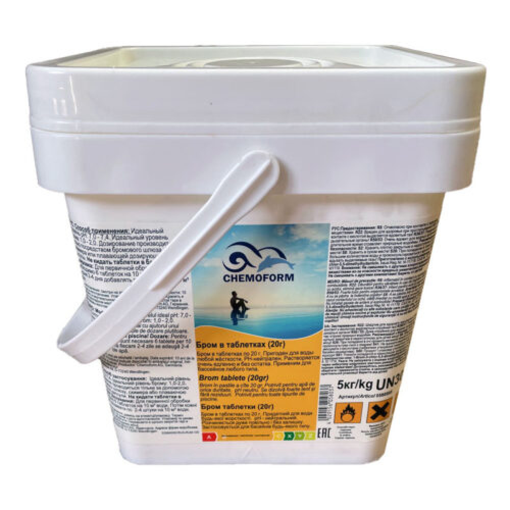 Как химическое вещество, бром имеет свойства, схожие с хлором. Он так же устраняет бактерии и органические загрязнения, но по-другому взаимодействует с ними. Если связанный хлор должен быть как можно быстрее удалён из бассейна, то значительная часть брома продолжает своё дезинфицирующее воздействие и после уничтожения бактерий. Вследствие этого его расход, в конечном итоге, ниже, чем у хлора. Использование бромных таблеток – идеальное решение для тех, кого беспокоит хлорный запах или раздражающее действие хлорпрепаратов, а также для использования в СПА и гидромассажных бассейнах благодаря стабильности в тёплой воде. Концентрацию брома следует поддерживать в пределах 2-3 мг/дм3.
