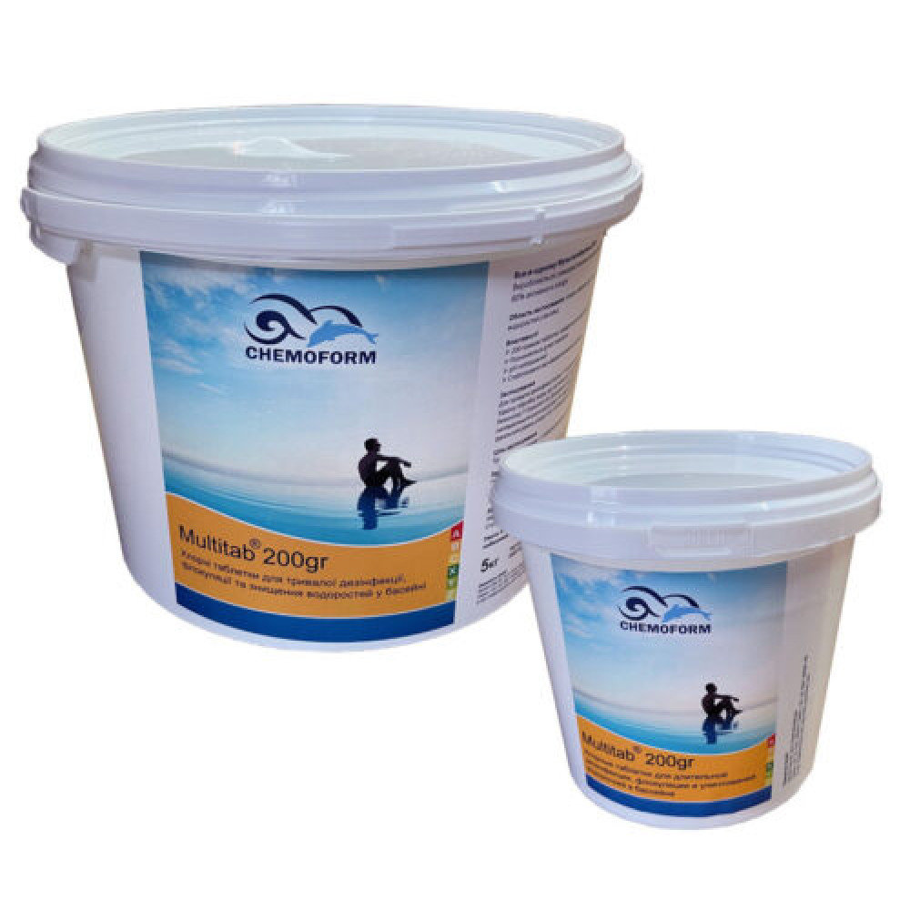 All—In—One Multitabletten – таблетки для комплексной обработки и длительного обеззараживания воды в бассейне. Содержит 80% активного хлора. Обладает эффектом «четыре в одном»: обеззараживание + борьба с водорослями + снижение мутности (коагуляция) + стабилизация уровня рН. Очень медленно растворяется, поддерживая постоянный необходимый уровень хлора в воде бассейна. Эффективно уничтожает бактерии, вирусы, грибки и все виды водорослей. Обеспечивает длительное дезинфицирующее и альгицидное действие. Разрушает и связывает органические загрязнения, вызывающие помутнение воды. Замедляет рост и снижение уровня рН. Не содержит извести, не оставляет осадок при растворении. Формула препарата позволяет использовать его в воде любой жесткости.