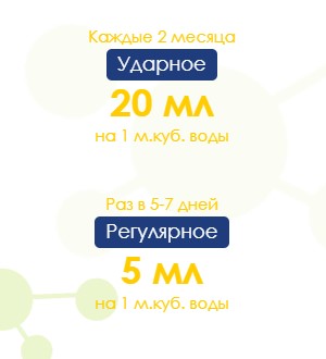 Регулярная обработка бассейна должна выполняться 1 раз в 5-7 дней, из расчета 5 мл состава на 1 м³ воды. Для улучшения эффективности препарата, рекомендуется использовать автоматические станции дозирования.