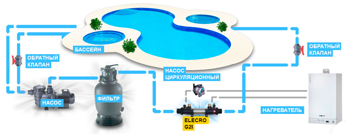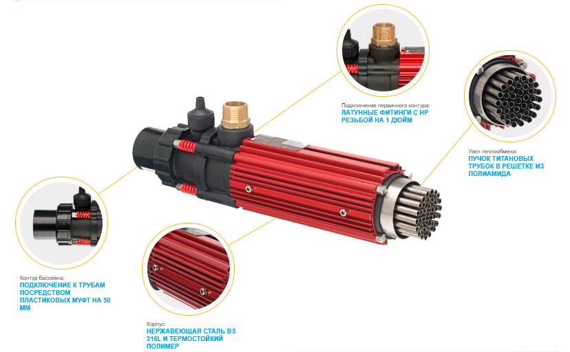 Диаметр подключения контура бассейна: 50 мм/1.5"; диаметр подключения контура отопления: 1 "