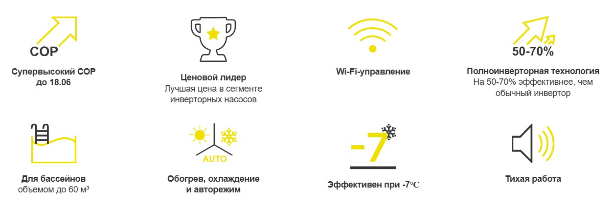 Такие показатели позволяют эффективно нагреть бассейн даже при пониженной температуре воздуха и поддерживать стабильный подогрев бассейна в течение всего сезона.
