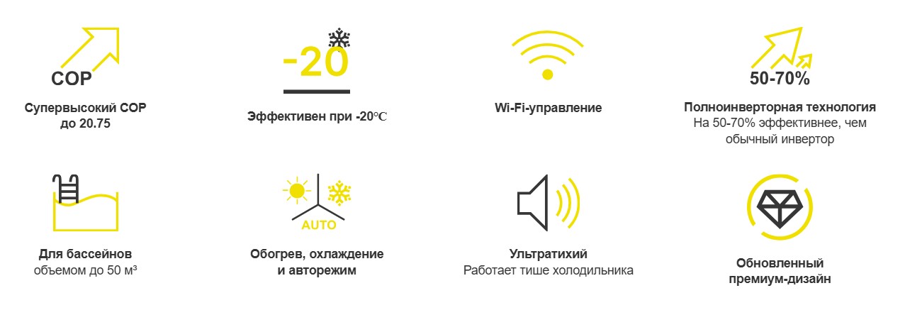 Рабочий диапазон температуры воздуха в режиме нагрева составляет от -7 °C до +43 °C. В режиме охлаждения оборудование функционирует при температуре воздуха от +10 °C до +43 °C. Диапазон температуры воды — от +9 °C до +40 °C. Такие параметры позволяют обеспечить полноценный нагрев воды а бассейне в условиях переменного климата.