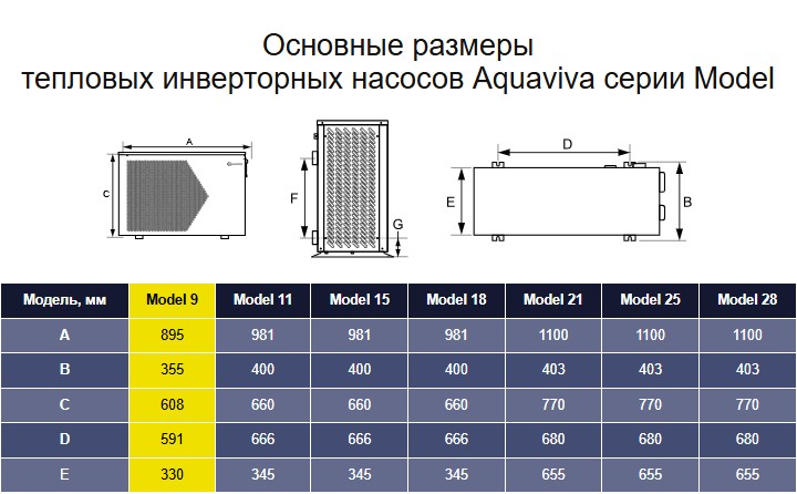 Инверторный тепловой насос Aquaviva Model 9 (9.5 кВт) — это компактное, но технически «взрослое» оборудование для бассейна, рассчитанное на эффективный нагрев бассейна и, при необходимости, охлаждение воды. Модель разработана для чаш объемом ориентировочно от 20 до 40 м³ (при условии использования теплоизоляционного покрытия в сезон), поэтому подходит для большинства частных бассейнов, купелей и небольших коммерческих объектов, где важно держать стабильную температуру без резких перепадов и без высоких затрат на электроэнергию.