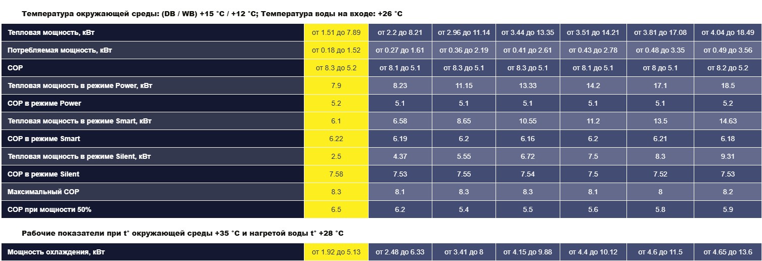 В режиме Power: 7,9 кВт при COP 5,2.