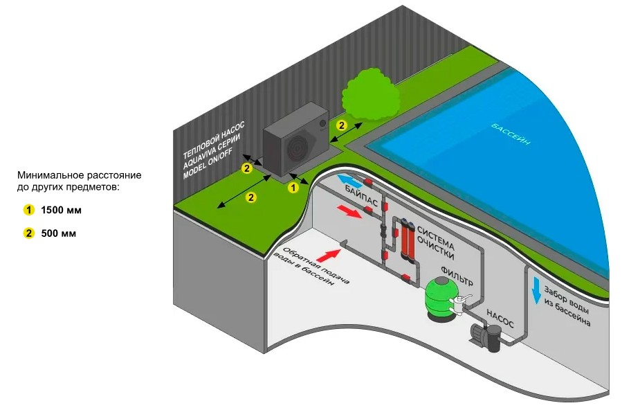 При правильном размещении оборудования подогрев бассейна осуществляется без дискомфорта для пользователей и окружающих.