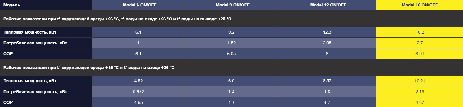 Тепловая мощность Aquaviva Model 16 ON/OFF составляет 16.2 кВт, что позволяет эффективно обслуживать бассейны среднего и большого объема. Такая мощность обеспечивает: