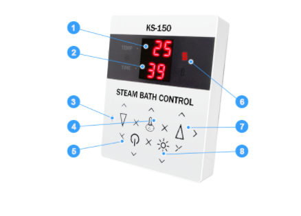 Управление парогенератора осуществляется через цифровой пульт управления KS-150 (в моделях до 2016 система комплектовалась контроллером KS200A). Цифровая панель KS-150 предоставит возможность потребителю задать температурный режим, цикл, время, а также управлять освещением в парной. На экране выводится отчет об ошибках и статусе работы системы. Основным отличием новой панели является сенсорный экран и защитное покрытие, которое позволяет устанавливать ее непосредственно в кабинке. Для ознакомления с подробным функционалом пульта KS-150 смотрите подробную ИНСТРУКЦИЮ.