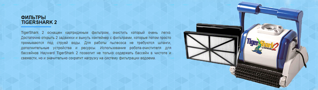 Чистку и надлежащий уход за большими водными резервуарами можно совершать посредством такого помощника, как робот-пылесос Hayward TigerShark 2. Данная модель упрощает и отлично справляется с чисткой вертикальных поверхностей, дна и других труднодоступных мест резервуара. Характеризуется устройство удобством и эффективностью работы, также отличается длительным сроком эксплуатации. Оборудование предназначено для бассейна площадью до 375 м², и для подключения оснащено кабелем 30 метров. Корпус данной модели выполнен из пластика, который надежно защищает систему от химических реагентов и проникновения воды. Система очистки осуществляется с помощью фильтрационного картриджа.