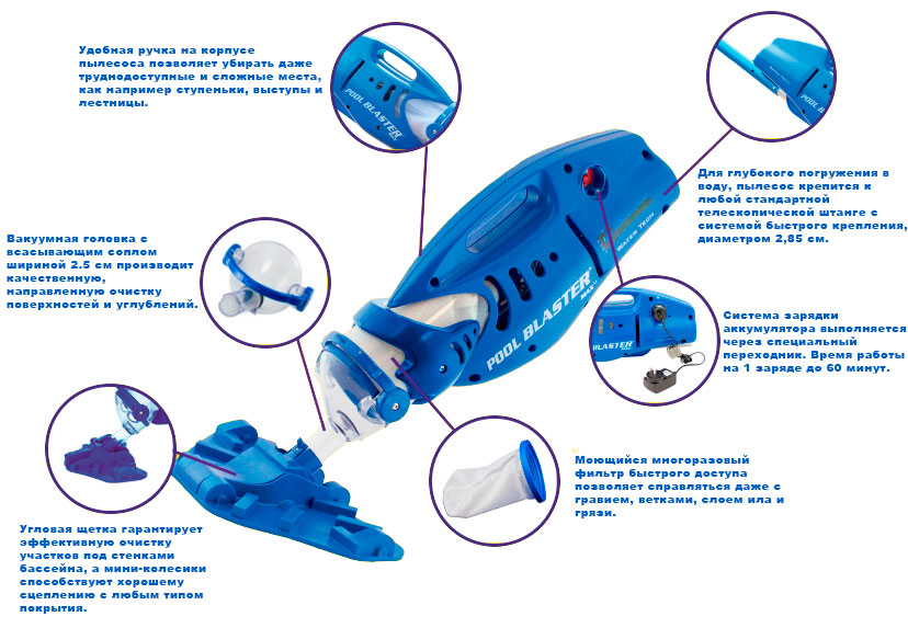 Оптимальным решением для уборки и поддержания чистоты в водном резервуаре или небольших СПА станет полуавтоматический ручной пылесос Watertech Pool Blaster MAX. Данная модель отличается весом 2,2 кг, функциональностью и высокой производительностью. Подходит для бассейна с разным типом покрытия. Устройство отлично справиться с различным мусором. Аппарат питается от заряжаемого аккумулятора, прост в использовании и легко чистится. При правильном применении и своевременном техобслуживании характеризуется большим сроком службы.