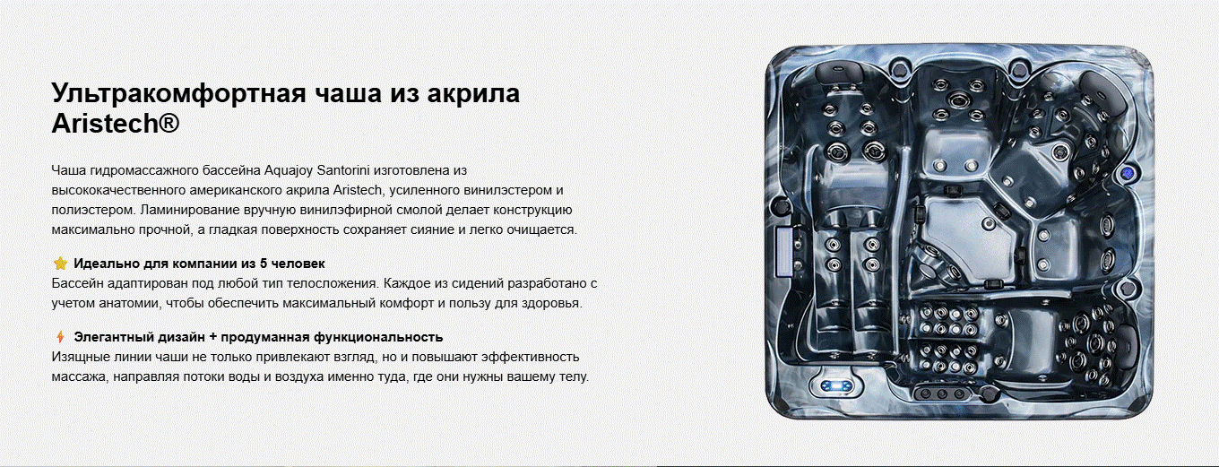 Aquajoy Santorini ориентирован на пользователей, которые планируют гидромассажный спа бассейн купить для личного пользования и ожидают от него стабильной работы, удобства обслуживания и реальной пользы от спа гидромассажа. Это бассейн джакузи, который органично вписывается в повседневный образ жизни, а не используется эпизодически.