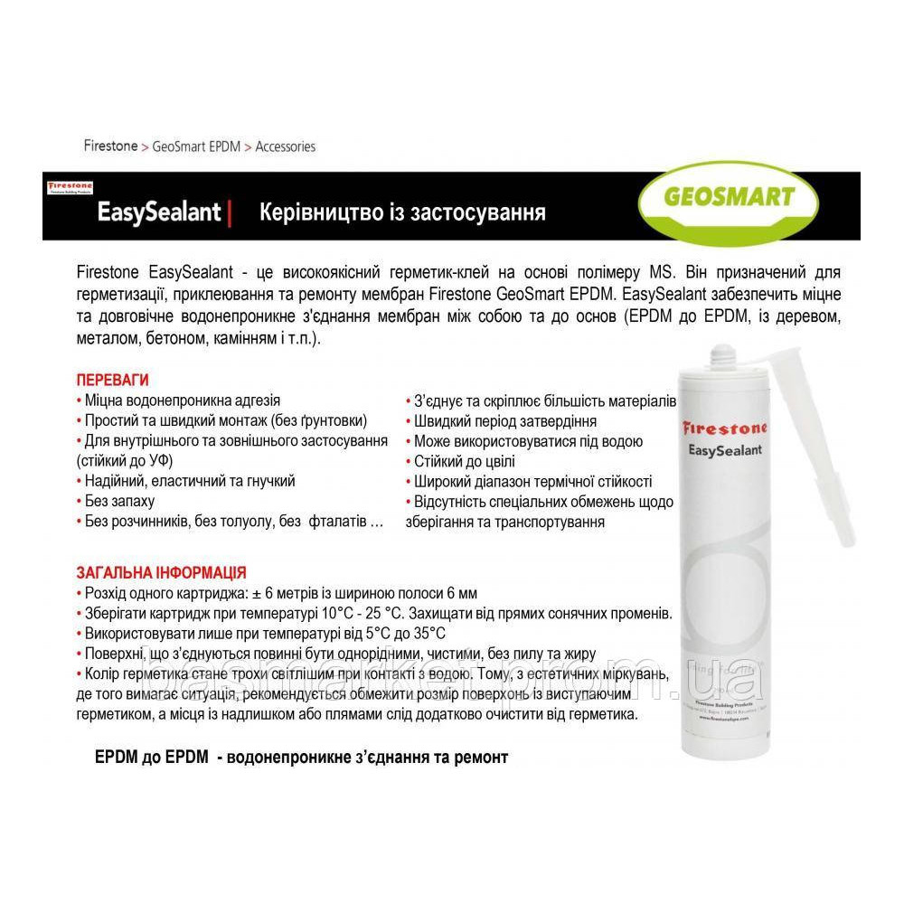 Firestone EasySealant - это высококачественный герметик - клей на основе полимера MS. Он предназначен для герметизации, приклеивания и ремонта мембран Firestone GeoSmart EPDM. EasySealant обеспечит прочное и долговечное водонепроницаемое соединение мембран между собой, а так же к прочим основаниям (EPDM к EPDM, с деревом, металлом, бетоном, камнями и т.п.).