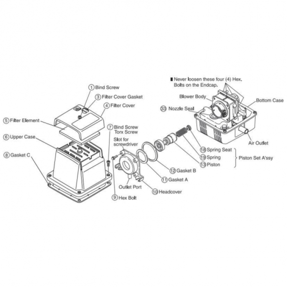 Конструкция данного безмасляного насоса основана на линейном поршневом магнитном двигателе, что обеспечивает долгий срок службы. Работа насоса исключительно тихая и энергосберегающая. Имеется встроенная система защиты от перепадов давления и напряжения, а также система самостоятельного охлаждения.