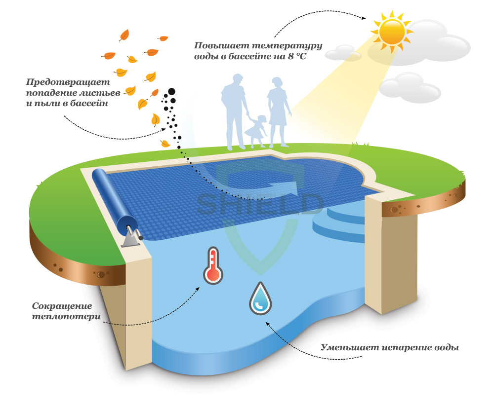 Енергозберігаюча плівка легко підганяється за розміром чаші, виполненной в різної конфігурації. Для цього полотно розстеляється, щоб полностью закрити водну поверхню, а потім підрізає по контурах резервуара. Замовити можна по телефону або через сайт.